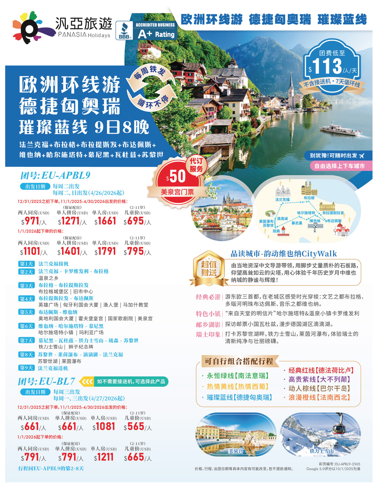 歐洲環線遊 德捷匈奧瑞 璀璨藍線9日8晚 [JT]
