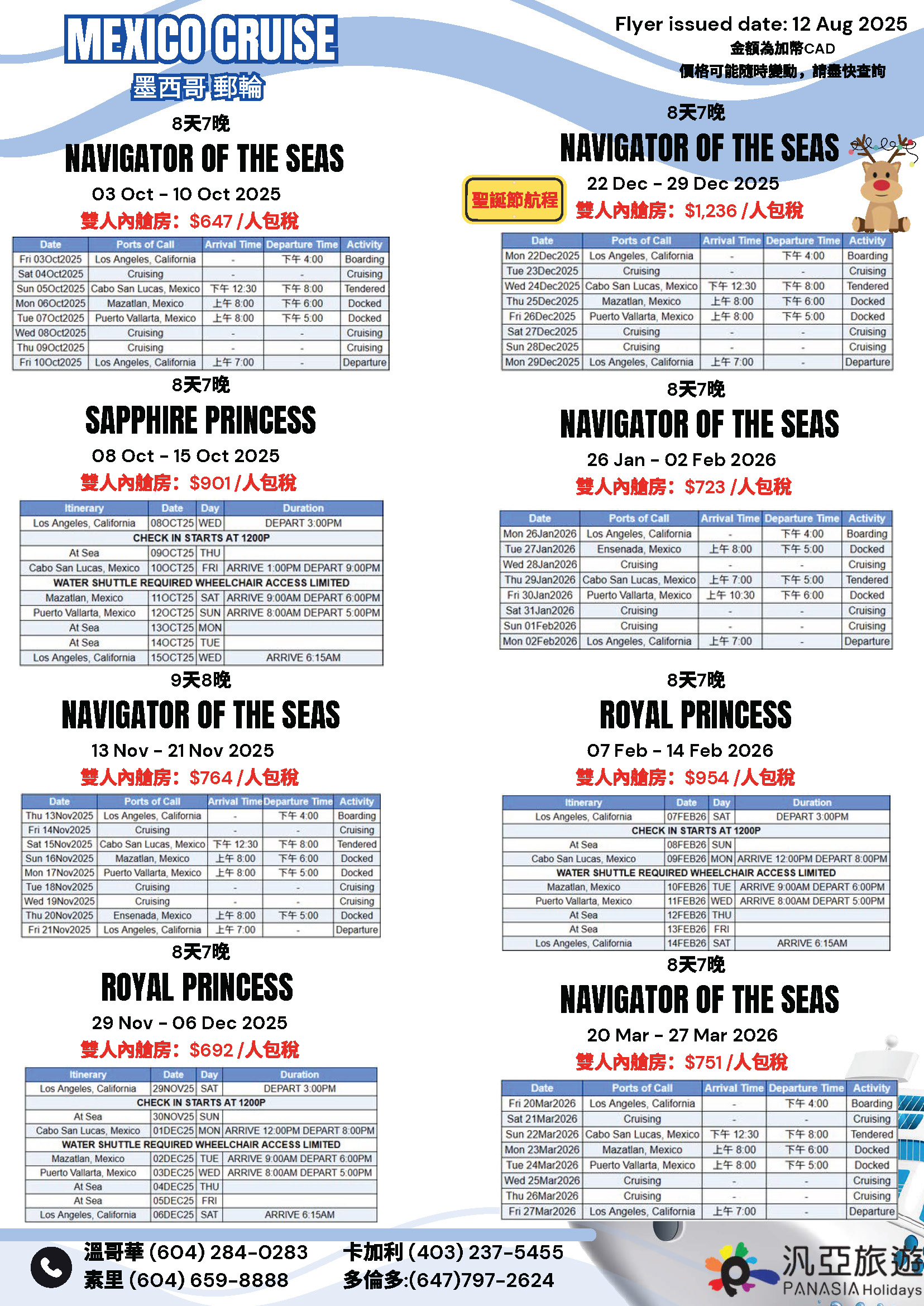 【2025年年末至2026年3月,多個啟航日期+多個航線】墨西哥郵輪之旅