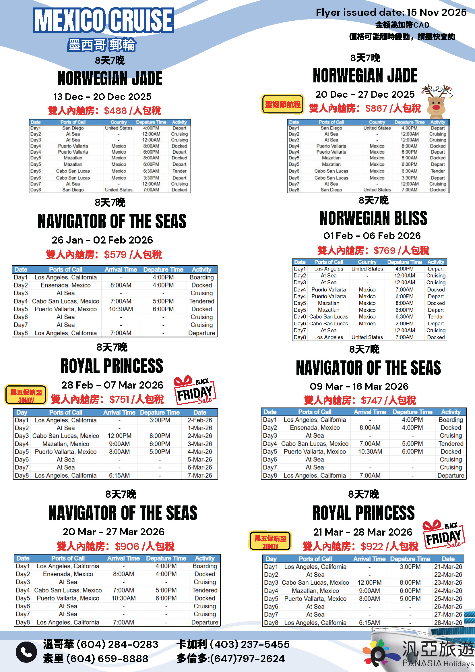 2025年12月至2026年3月航程:聖地牙哥/洛杉磯上船】8天7晚墨西哥黑五快閃特價(Flash Delas)![PH]