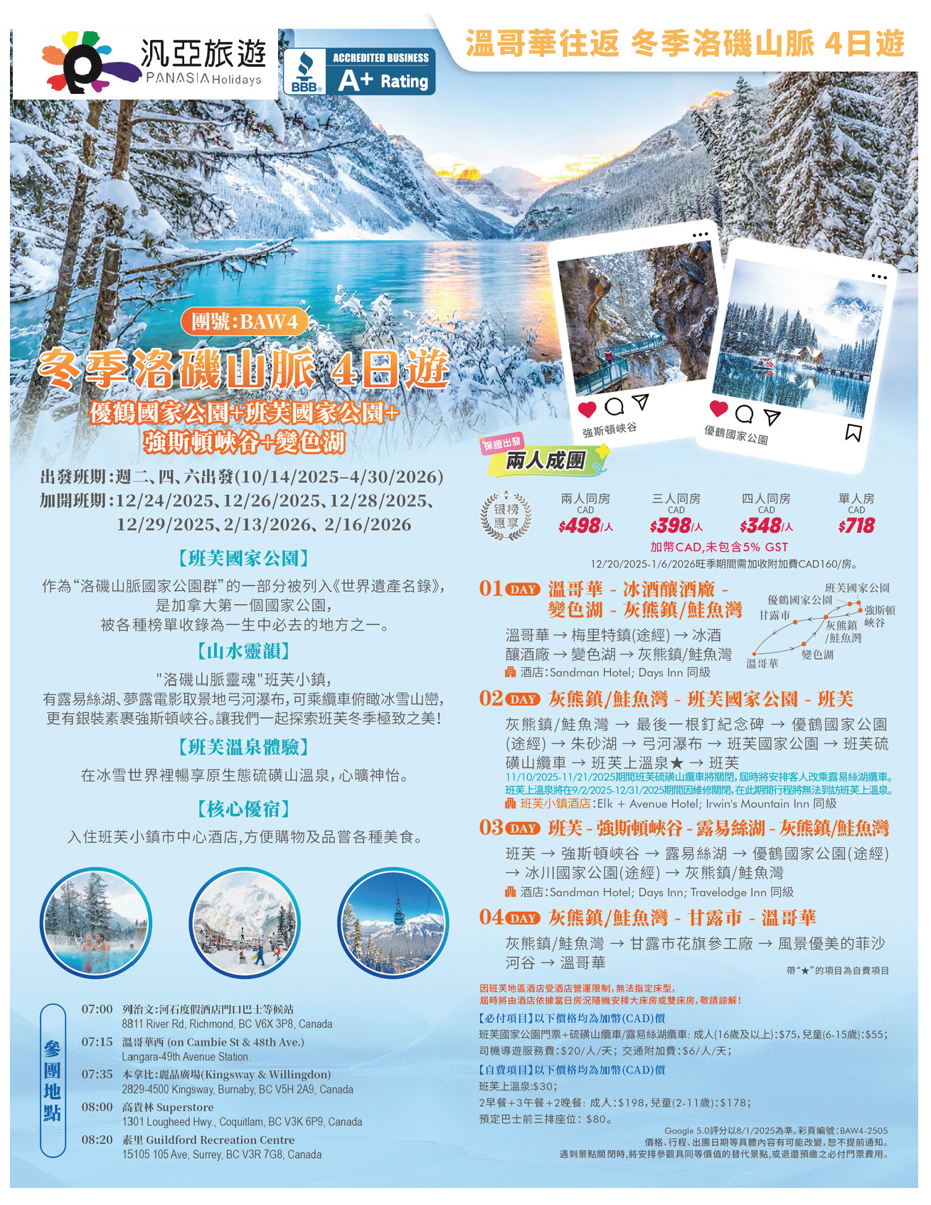(雪花飛舞的冬天)提供接送機服務、深度遊覽洛磯山脈國家公園,欣賞仙境般的美麗碧綠湖景,感受加拿大超自然山水之靈氣、日月之精華