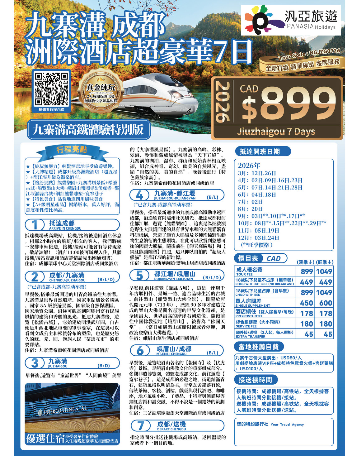 2026年九寨溝 成都 洲際酒店超豪華7日[CT]