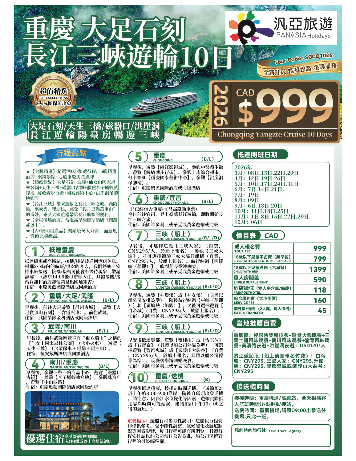 【二人成團,保證出發】2026年重慶、大足石刻、長江三峽遊輪10日[CT]