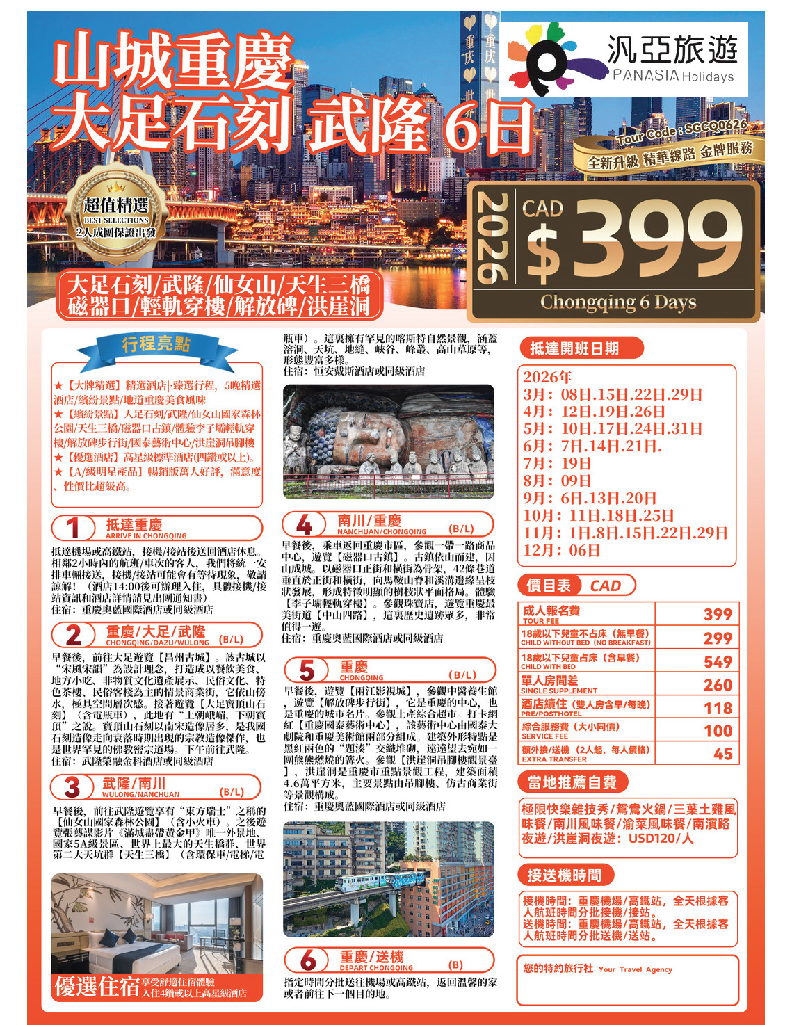 【二人成團,保證出發】2026年山城重慶、大足石刻、武隆6日[CT]