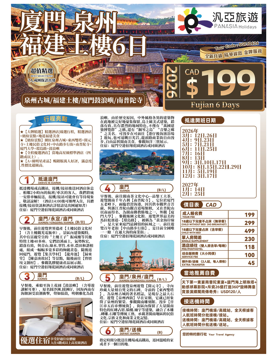 【二人成團,保證出發】2026年廈門、泉州、福建土樓6日[CT]
