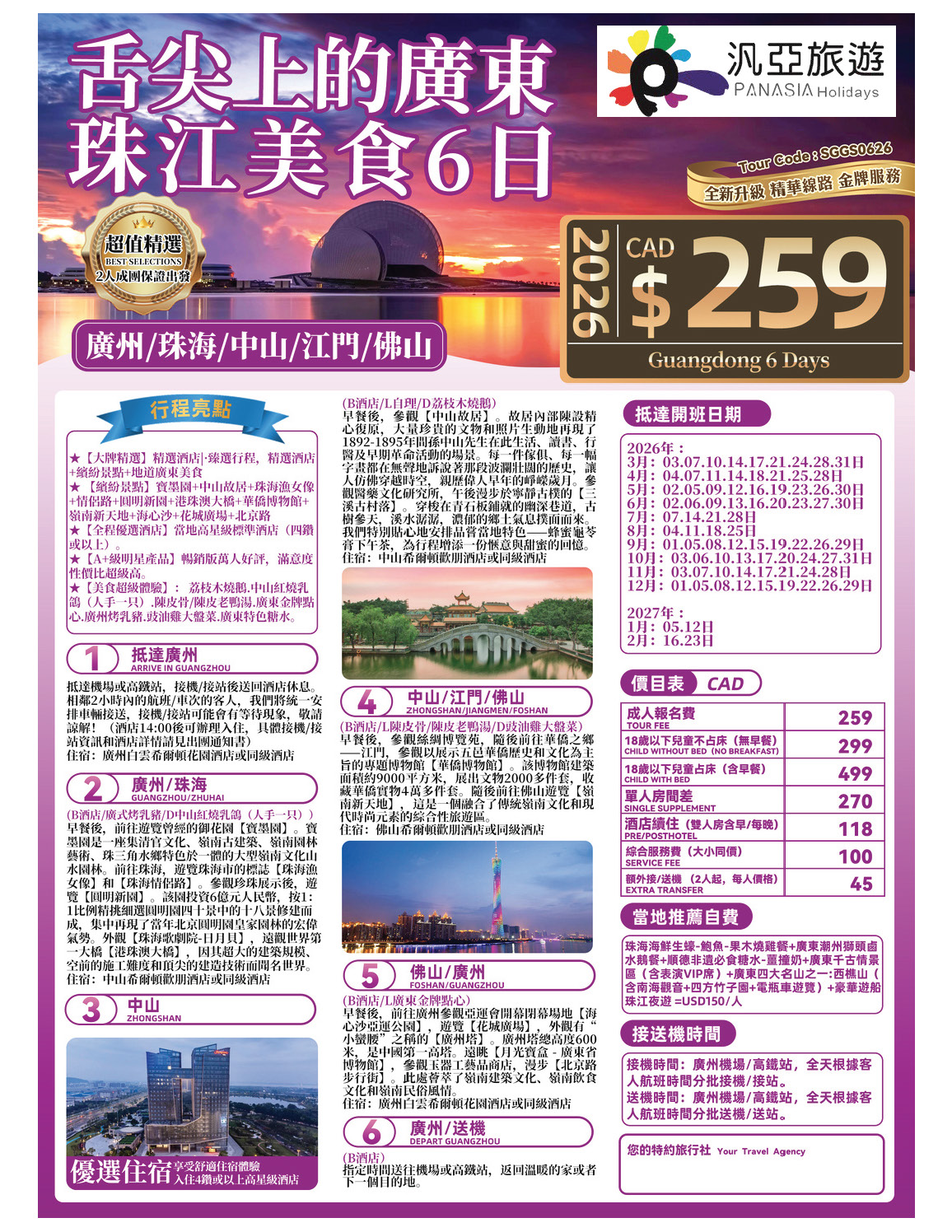 【二人成團,保證出發】2026年舌尖上的廣東 珠江美食6日[CT]