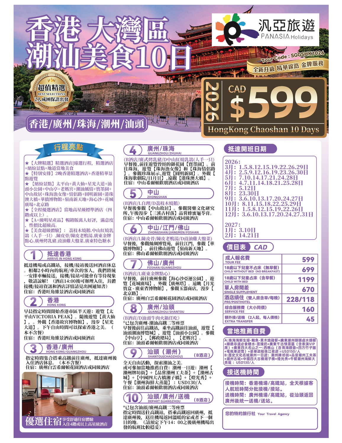 【二人成團,保證出發】2026年香港、大灣區、潮汕美食10日[CT]