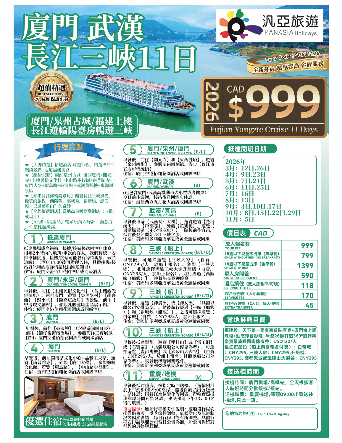 【二人成團,保證出發】2026年廈門、武漢、長江三峽11日[CT]
