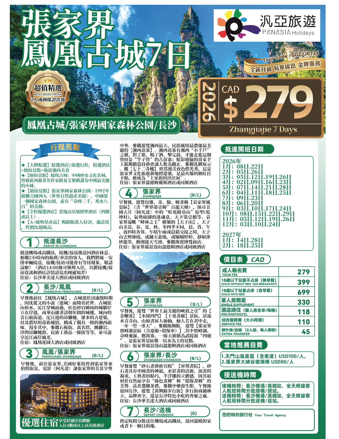 【二人成團,保證出發】2026年張家界、鳳凰古城7日[CT]