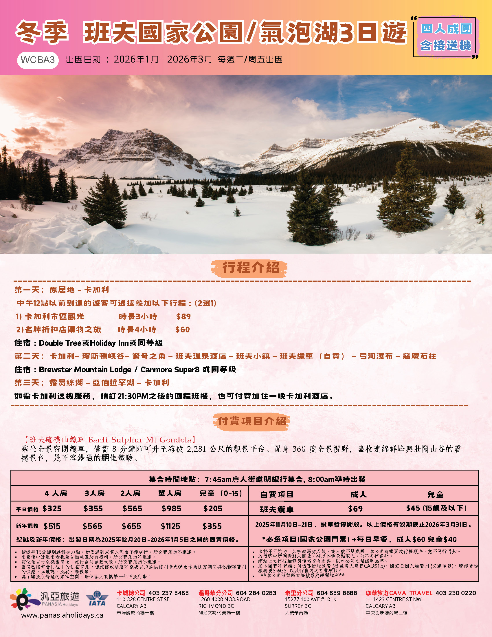 【冬季】班夫國家公園/氣泡湖3日遊 【WCBA3】